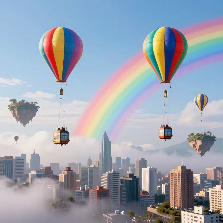 Photograph of colorful hot air balloons with rainbow trails over a foggy cityscape, featuring floating islands and tall skyscrapers.