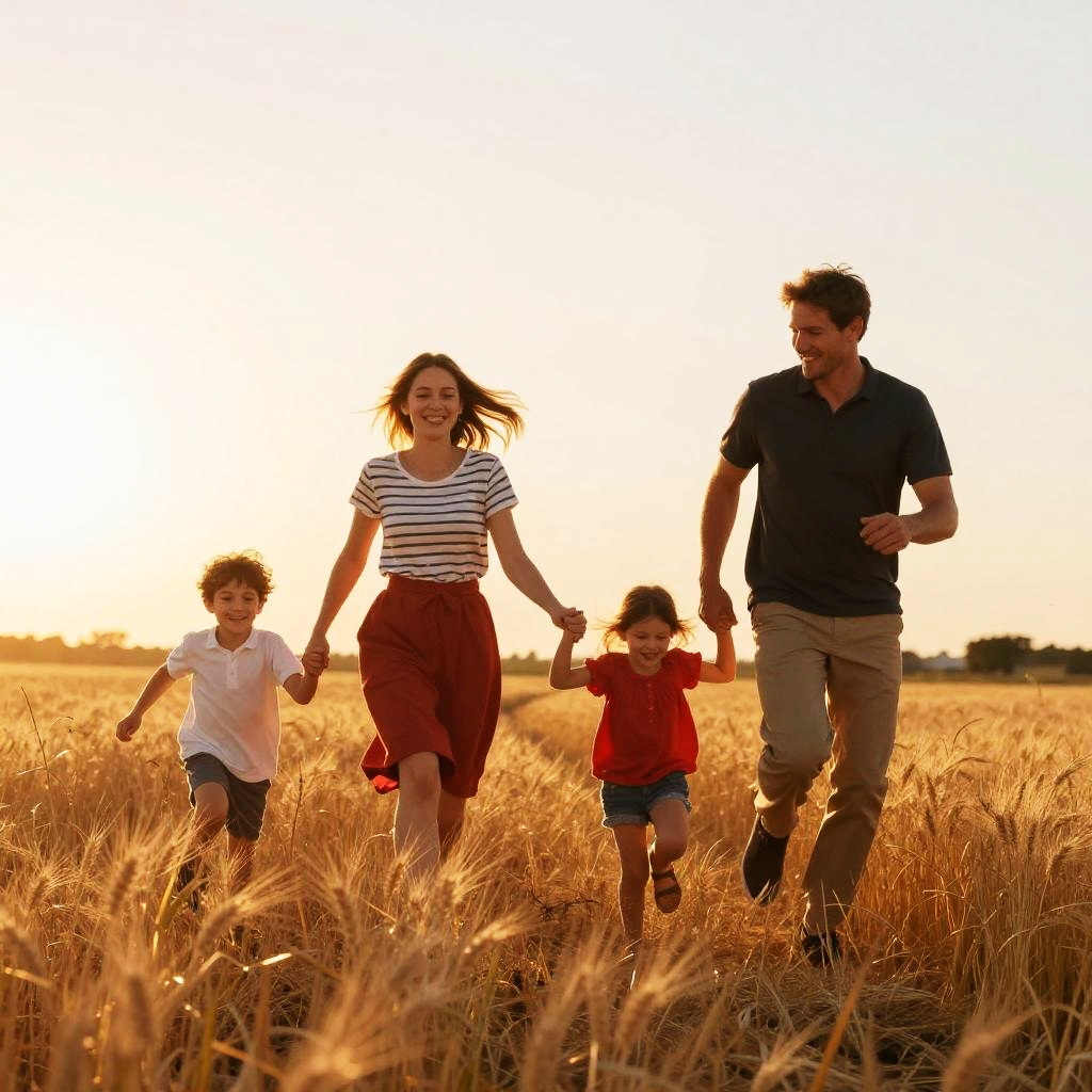 Photograph of a family of three running away from the camera on a grassy field at sunset. The father, in a blue shirt and black pants, holds the hand of the young daughter in a white dress, while the mother in a white top and beige pants runs ahead. The bright sun is low in the sky, casting a warm glow. The background includes a distant water body and trees.