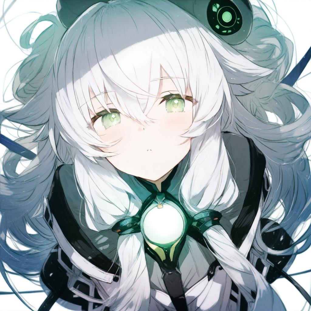 Digital anime-style artwork of a young female character with very long white hair and vibrant green eyes. The character has sidelocks and hair flaps, dressed in a futuristic, dark-themed outfit with glowing green accessory at the chest. The artwork features a soft pastel color palette with intricate details in hair and clothing, inspired by the style of artist Toi8 and animagine.