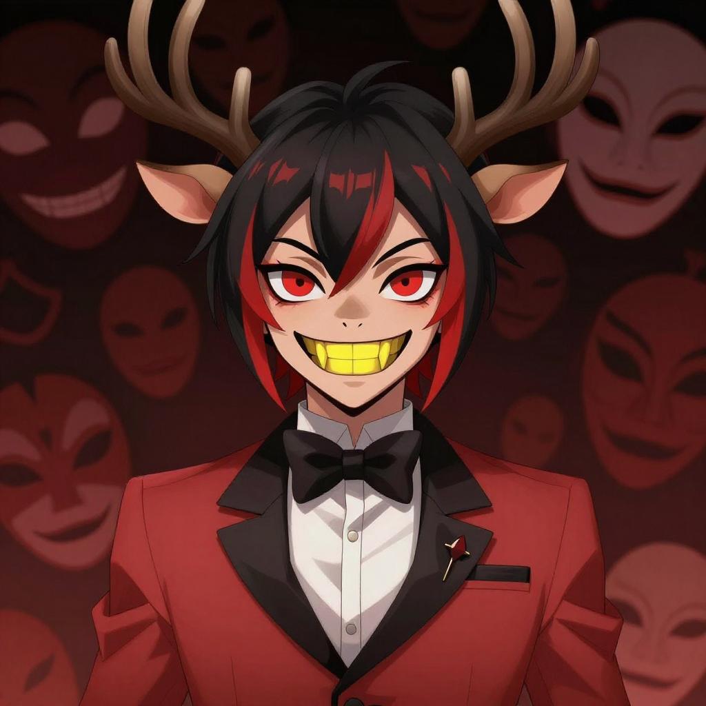 Anime-style digital illustration of a demon boy character with antlers, deer ears, and sharp yellow teeth. He has red sclera and red eyes, black and red short hair, and wears a red suit with black lapels, a black bow tie, and a white shirt. The background features dark red and black abstract patterns with symbolic faces resembling masks.