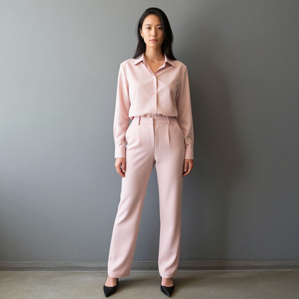 Photograph of a young woman standing against a plain gray wall. She has long, straight black hair and a neutral expression. She wears a light pink, long-sleeved, button-up jumpsuit with a belted waist, and black high-heeled shoes. The jumpsuit has a classic, tailored fit with a slight flare at the bottom. The lighting is even, highlighting the soft texture and smooth fabric of the jumpsuit. The floor is a simple, light gray concrete. The overall style is modern and minimalist.
