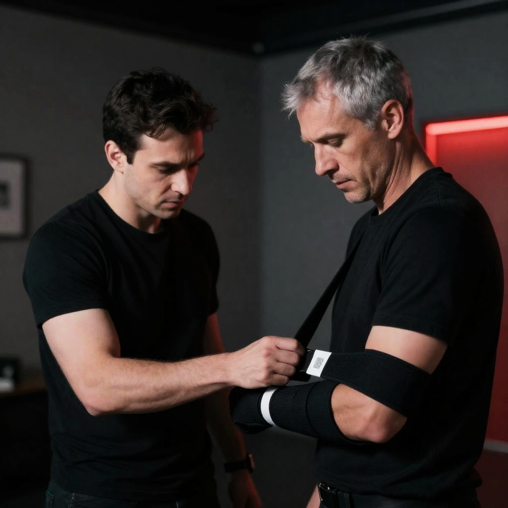 Two men in a dimly lit room. The man on the right has short gray hair, wearing a black shirt and gloves, has his arm strapped with a wristband, looking down. The man on the left has short dark hair, black shirt, focused expression, assisting with the strap. Background: gray walls, red light in the distance.