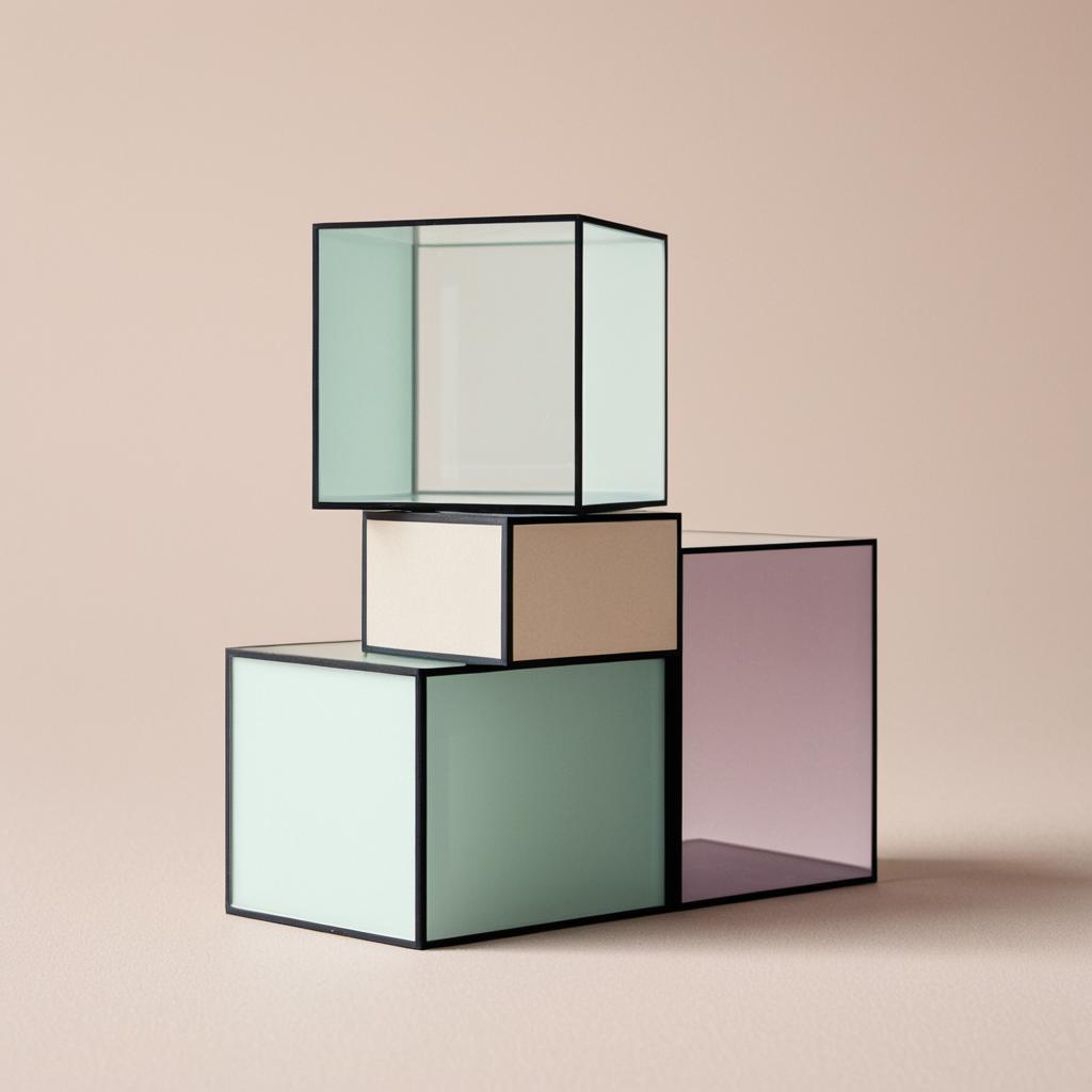 A modern abstract 3D artwork featuring modular geometric shapes and crystalline elements in icy blue, saffron yellow, warm beige, and misty white colors. The composition includes pyramidal and square forms arranged on a neutral beige background, creating a visually impactful and contemporary design.