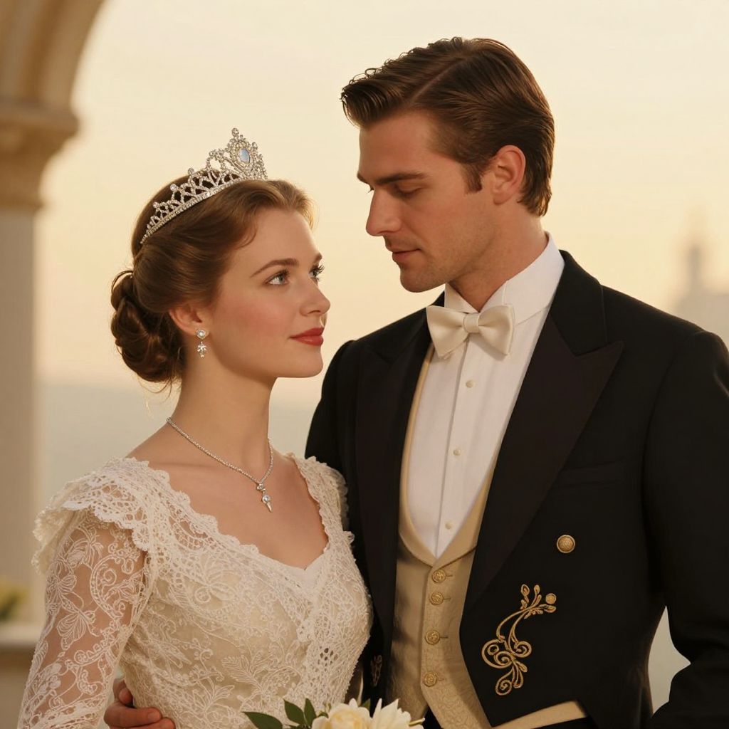 A digitally rendered, high-definition illustration depicts a regal couple in formal attire, with the woman adorned in a tiara and lace dress, exuding elegance and grace, while the man wears a black tuxedo with gold embroidery, set against a warm, golden-hour backdrop that enhances the romantic and cinematic atmosphere reminiscent of classic fairy tale narratives.