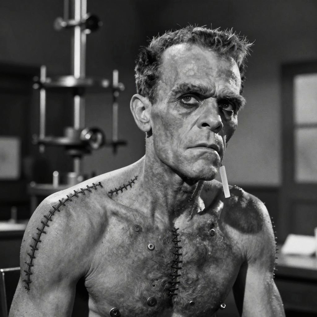 Accurate Frankenstein's monster in a vintage 1930s style black and white film scene, with exaggerated bolts, prominent scar stitches, and looming laboratory equipment in the background
