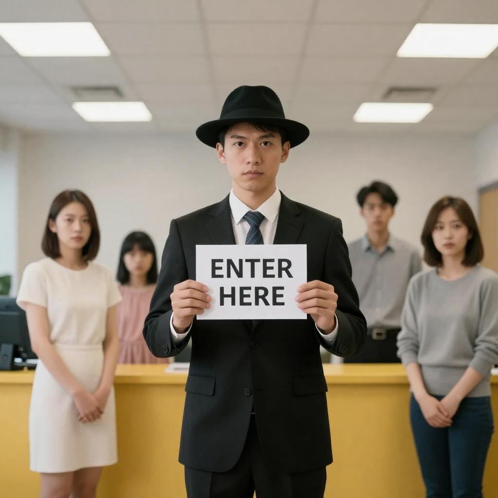 Photograph of a office waiting room. Central figure: man in black suit and hat, holding sign reading "ENTER HERE Please." Background: four people, two women, one man, and one child. Ceiling tiles, fluorescent lights, yellow counter. Woman on left wears white dress, child beside her in pink dress. Man on right wears grey shirt. Woman on far right wears grey sweater. Intense expressions. Office setting.