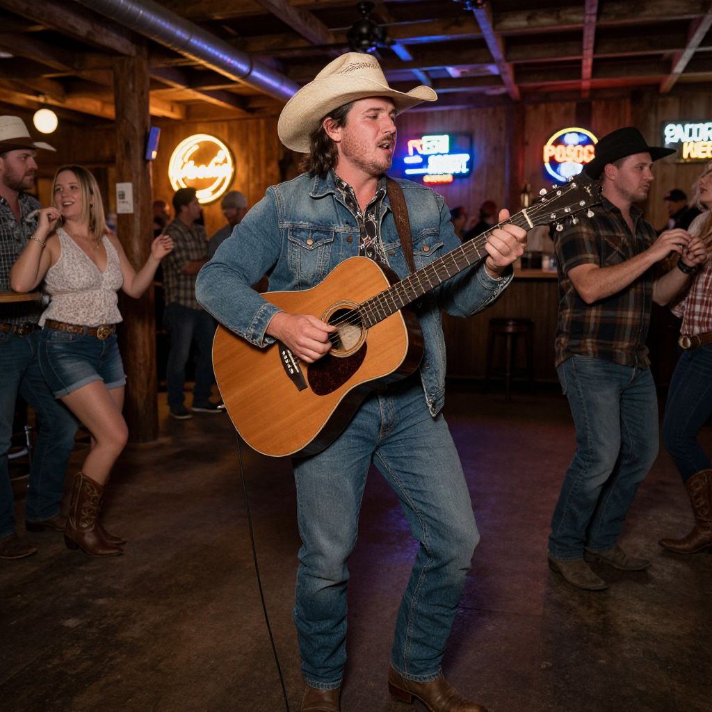 Texan man in a lively country music bar, wearing a straw cowboy hat, denim jacket, and boots, playing an acoustic guitar passionately, with rustic wooden interiors, neon signs, and a crowd enjoying southern hospitality and dance.