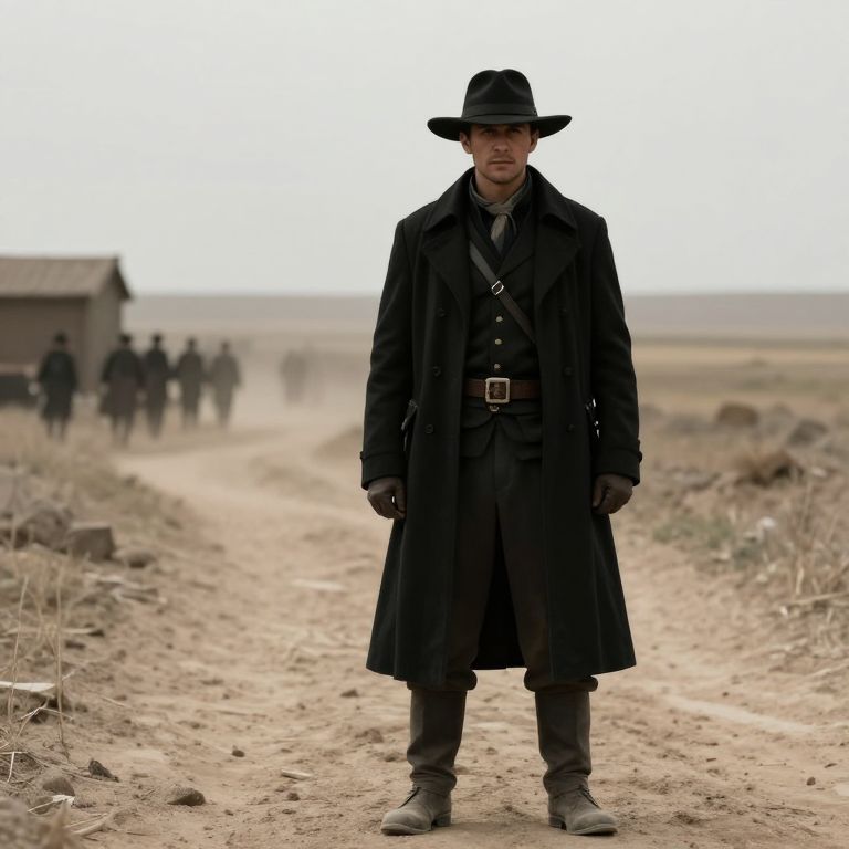 Amidst a desolate frontier, a solitary figure in a black coat and hat stands resolute, embodying the weight of duty and the relentless march of fate, while the dusty trail behind whispers of past conflicts and the enduring struggle for justice.