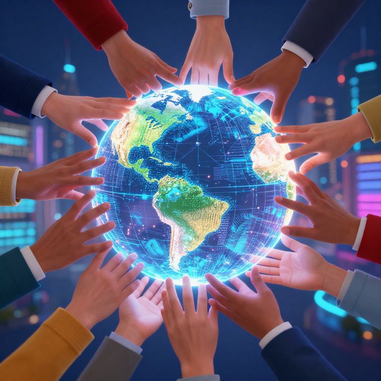Co-creatie concept visualized as diverse hands collaborating around a glowing digital globe, symbolizing innovation and unity, vibrant colors, futuristic cityscape in the background, dynamic composition, high detail, digital art style.