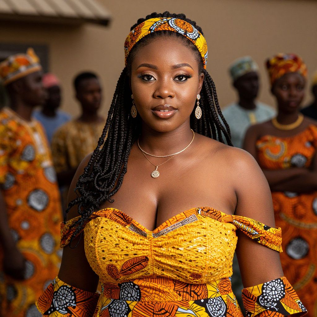 A beautiful woman with big tits and a sexy, confident vibe is wearing a traditional African outfit featuring vibrant yellow and orange colors, complete with a decorative headband, a delicate necklace, and elegant earrings. Her long hair is styled in intricate braids that frame her face, adding to her graceful and cultural charm. She stands in a softly lit setting with a blurred background showing other people in the distance, giving a sense of a lively community gathering. The atmosphere is warm and authentic, highlighting her elegance and cultural pride.