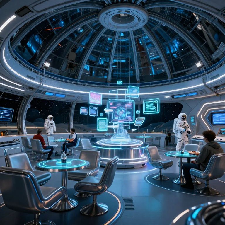Lounch space station interior, futuristic lounge with sleek metallic chairs, holographic displays floating above tables, neon blue lighting, astronauts in casual uniforms, expansive glass dome with stars visible outside, sci-fi concept art.