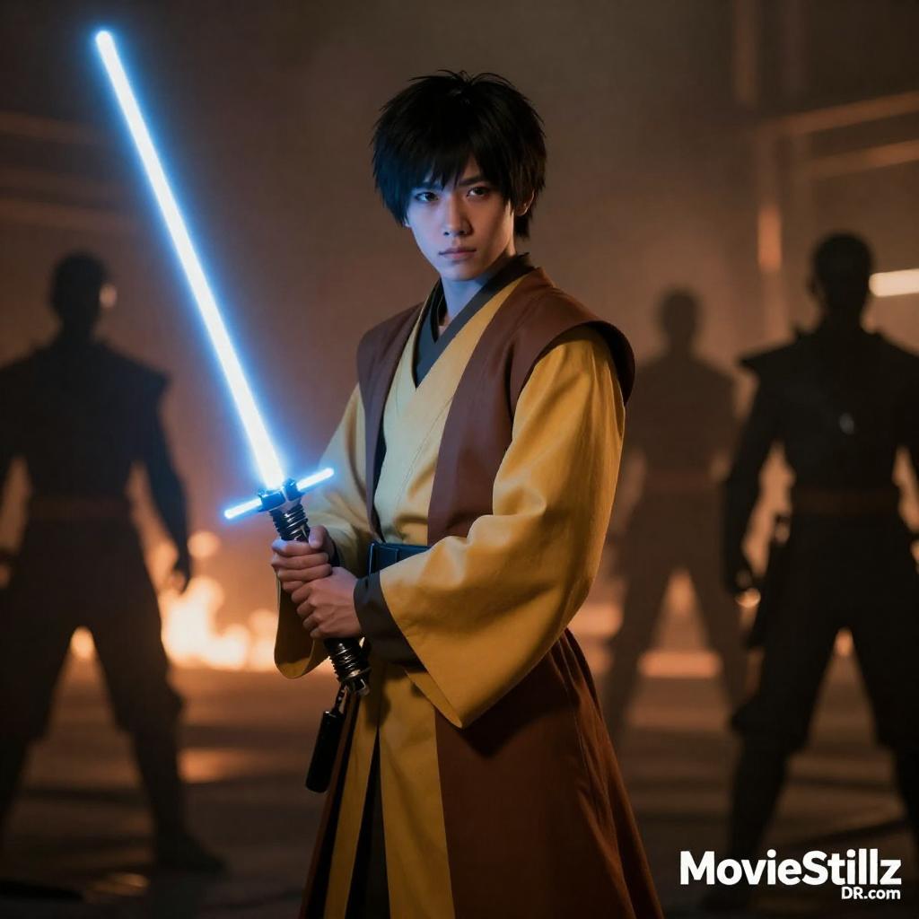 Digital artwork depicting a young Asian man with short black hair wearing a brown and yellow robe, holding a glowing blue lightsaber. He stands confidently in a dim and fiery industrial environment, backlit by flames and surrounded by three shadowy figures in the background. The scene evokes a futuristic or sci-fi atmosphere.