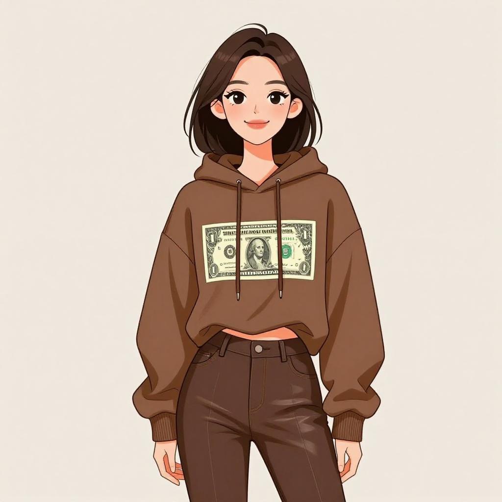 Illustration of a young woman with medium-length dark hair and fair skin, smiling. She is wearing an oversized brown hoodie with a graphic print of a dollar bill on the front, featuring long sleeves and ribbed cuffs. The outfit is paired with high-waisted, tight-fitting faux leather brown pants. The background is plain light-colored, creating a studio-like setting.