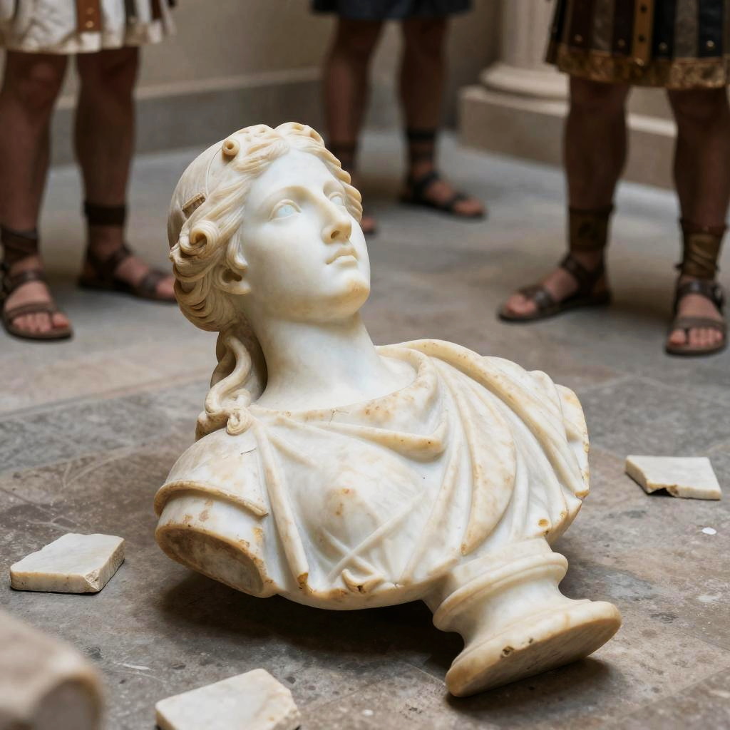 A marble bust of a young woman with wavy blonde hair and blue eyes lies on the ground. Background shows multiple people wearing ancient Roman-style clothing and sandals. Cracked marble pieces surround the bust. People’s legs and feet visible.