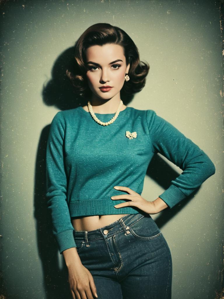 Portrait of a young woman with retro styled curled brunette hair wearing a teal long sleeve cropped sweater with a butterfly brooch and a pearl necklace, paired with high-waisted dark blue jeans. The image has a vintage aesthetic with a plain background and soft lighting highlighting her poised expression and classic makeup.