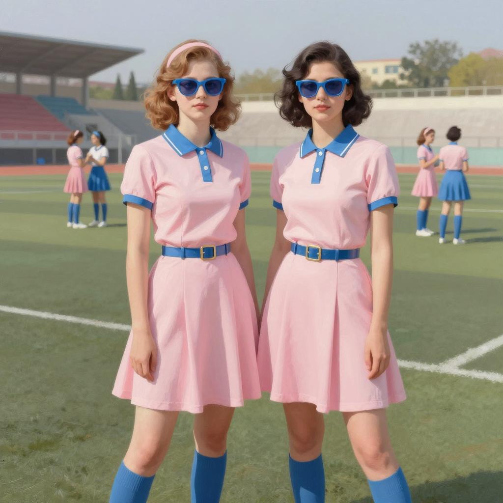 Two young women dressed in vintage pink sporty dresses with blue collars and belts, wearing blue sunglasses and blue knee-high socks, standing confidently on a green sports field with a stadium and other figures in the background, impressionist painting style with soft brush strokes, muted pastel color scheme focusing on pink and blue colors, vintage sporty atmosphere