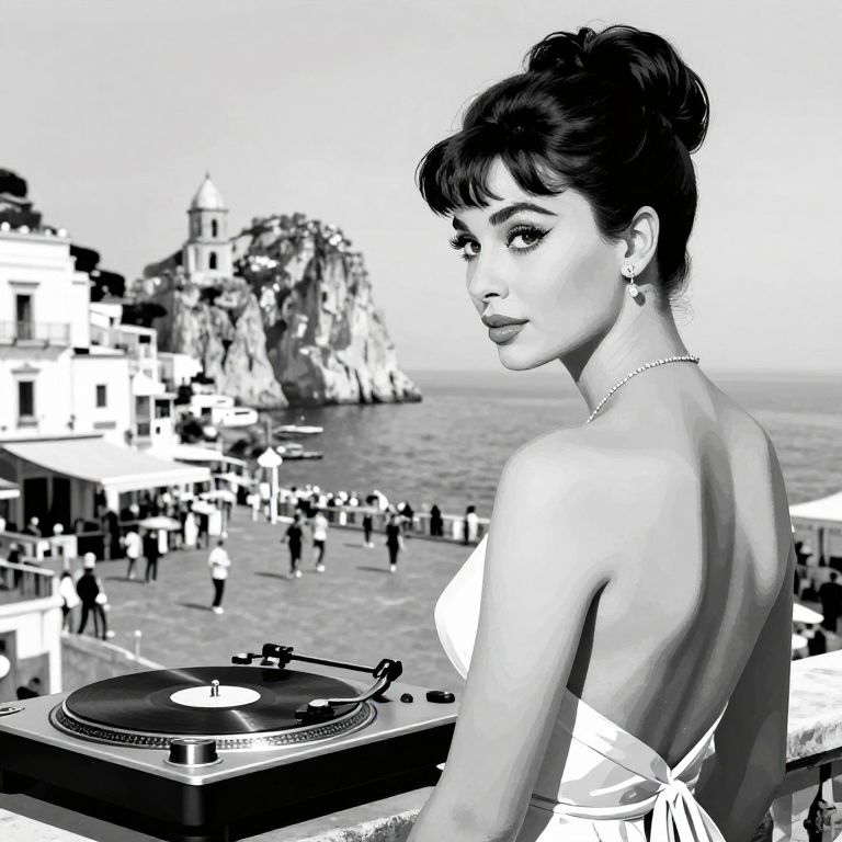 This black-and-white photograph features a glamorous woman with dark, wavy hair styled in an elegant updo, wearing a strapless dress with a bow at the back. She gazes over her shoulder with a confident expression, her makeup accentuating her eyes and lips. In the foreground, there's a vintage record player. The background shows a bustling seaside town with people walking along the shore and buildings perched on a cliffside. The ocean is visible, and a church with a bell tower stands out on the cliff. The image has a retro, classic feel, reminiscent of 1950s or 60s photography.