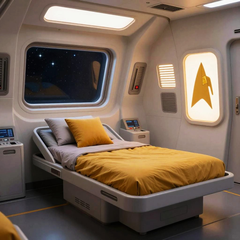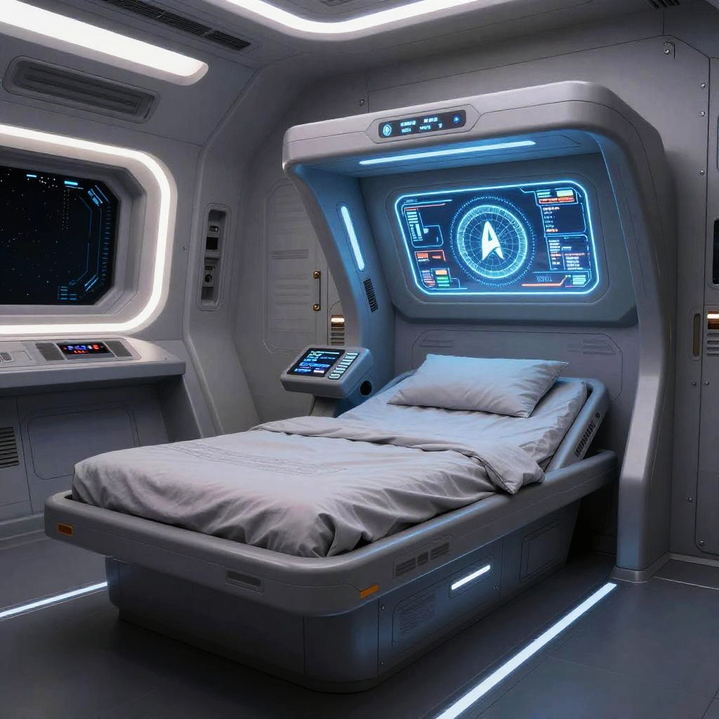 Star Trek bed with a high-tech control panel integrated into the headboard, surrounded by holographic displays, set in a spaceship's private quarters, futuristic and immersive