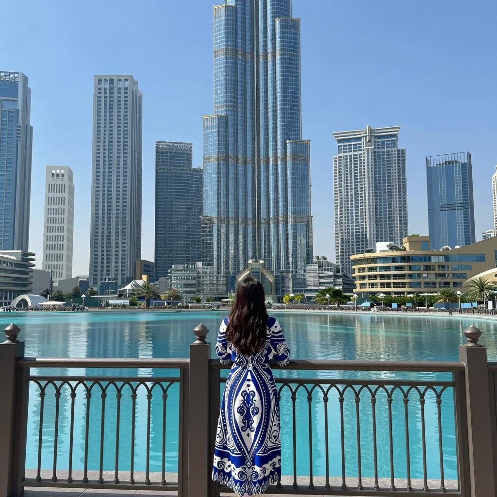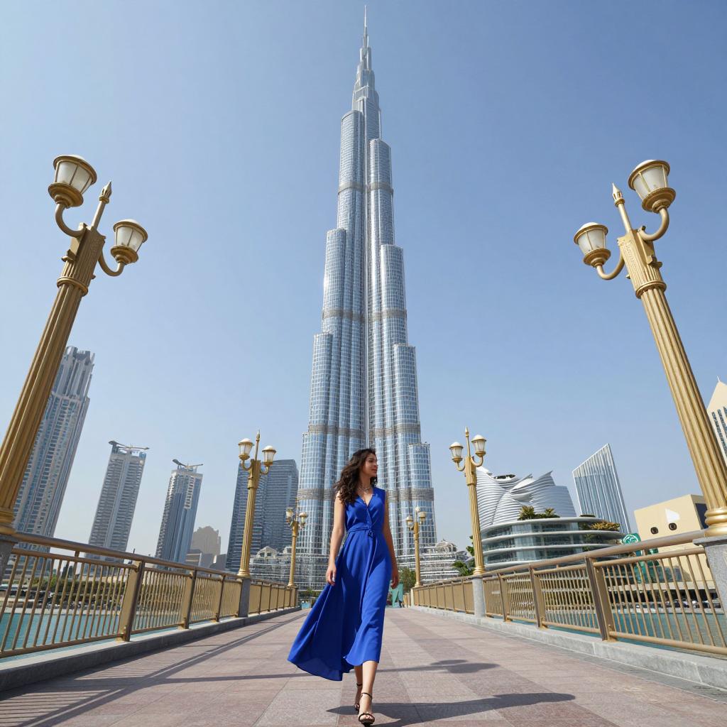 A woman in a flowing blue dress walks confidently on a modern pedestrian bridge with golden railings and decorative lamp posts. The towering Burj Khalifa skyscraper and urban cityscape of Dubai are visible in the background under a clear, bright blue sky during a sunny day.