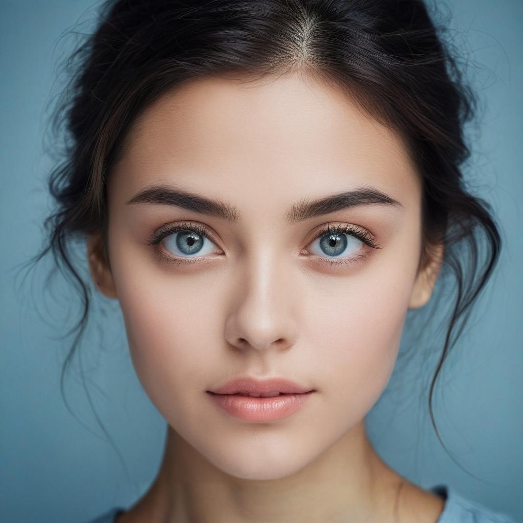 A close-up portrait of a young woman with large expressive eyes, smooth skin, slightly wavy dark hair styled back, cinematic soft lighting highlighting facial features and collarbones, natural muted tones with subtle blue-gray background, fine detailed skin texture, soft shadows enhancing depth, serene and calm expression