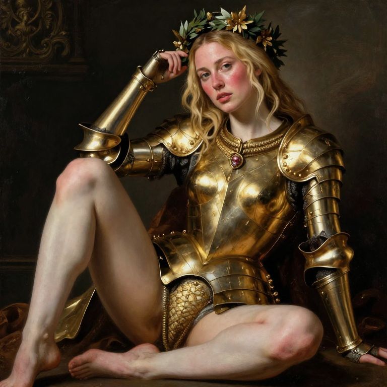Photorealistic digital painting of a fair-skinned, blonde woman in golden armor, crowned with leaves, sitting with one leg raised, against a dark