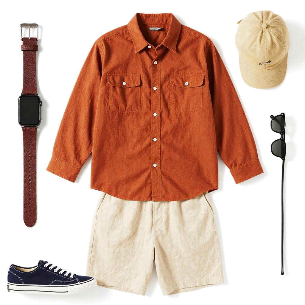 Flat lay of a casual weekend outfit featuring a rust-colored cotton button-up shirt paired with beige linen shorts. Accessories include a beige cap, black sunglasses, a brown leather strap smartwatch, and navy blue canvas sneakers, styled for a relaxed and aesthetic look.