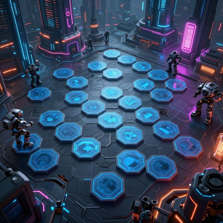Game board layout featuring futuristic sci-fi cityscape, neon lights, robotic units, grid-based hexagonal tiles, immersive cyberpunk atmosphere, sharp details, digital art style