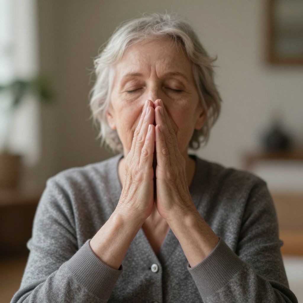 In a quiet sanctuary of light and stillness, a senior woman's hands pressed together in namaste invite a profound sense of serenity, embodying the timeless journey of inner peace and the enduring spirit of mindfulness.