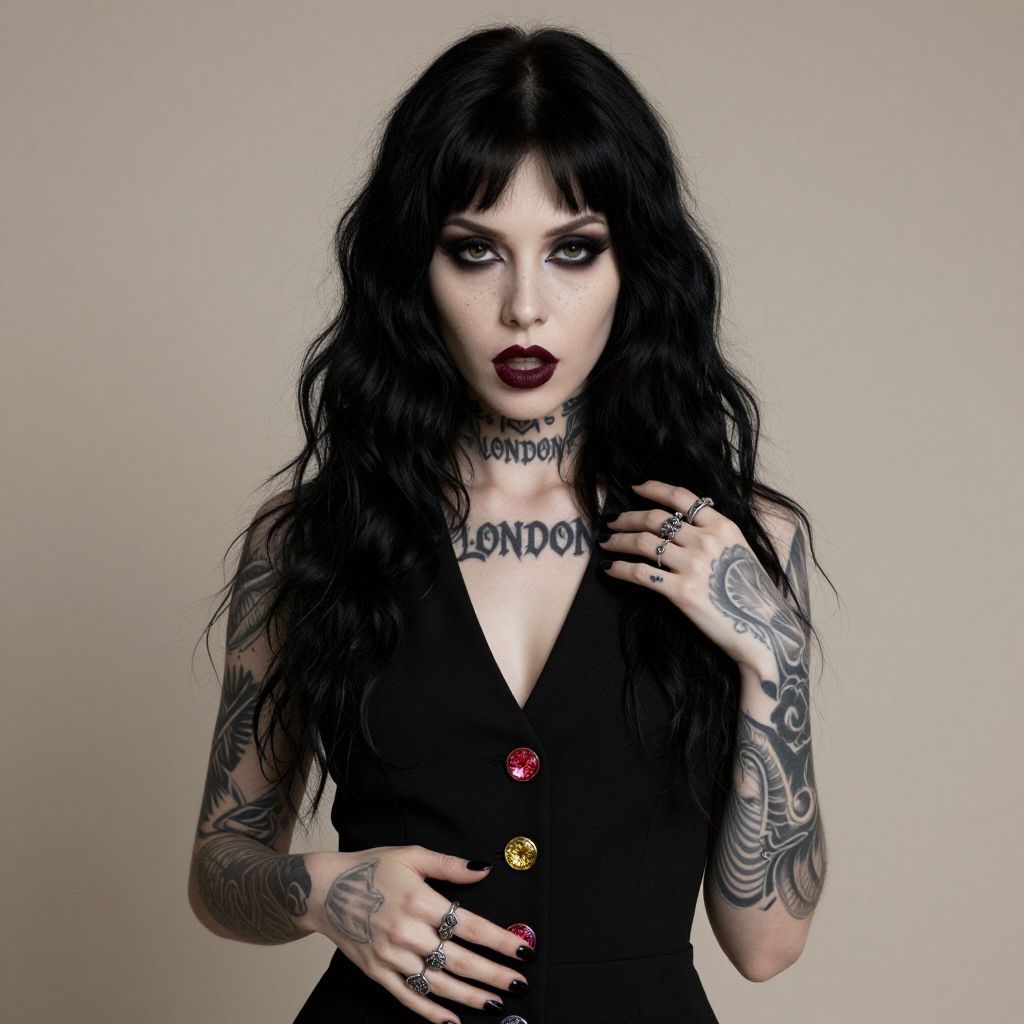 Photograph of a pale-skinned woman with long, wavy black hair. She's wearing dark, smoky eye makeup, heavy black lipstick, and white face paint with dark accents around her eyes. Her outfit is black and patterned, with a high-neck design. The background is dark and blurred, making her the focal point. Her expression is slightly tilted, giving a mysterious vibe.
