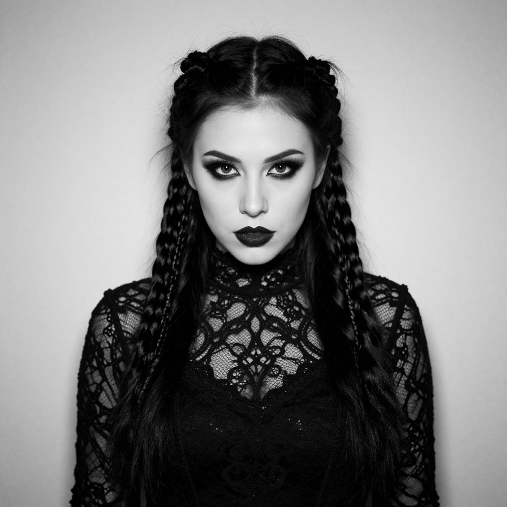 Gothic-style photograph of a pale woman with long, wavy black hair, heavy black eyeliner, and dark lipstick, wearing a black lace