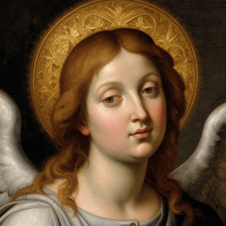 This is a digital reproduction of a Renaissance-style oil painting depicting a young, fair-skinned woman with a serene expression. She has light brown hair covered by a brown headscarf and wears a golden-brown, intricately patterned robe with a high-necked, dark brown dress underneath. Her right hand gently touches her chest, while her left arm is draped across her body. The background features dimly lit, architectural elements with arched columns. The lighting highlights her delicate features and soft skin, creating a divine, ethereal atmosphere. The rich, warm colors and detailed textures of the fabric emphasize the painting's historical and artistic style.
