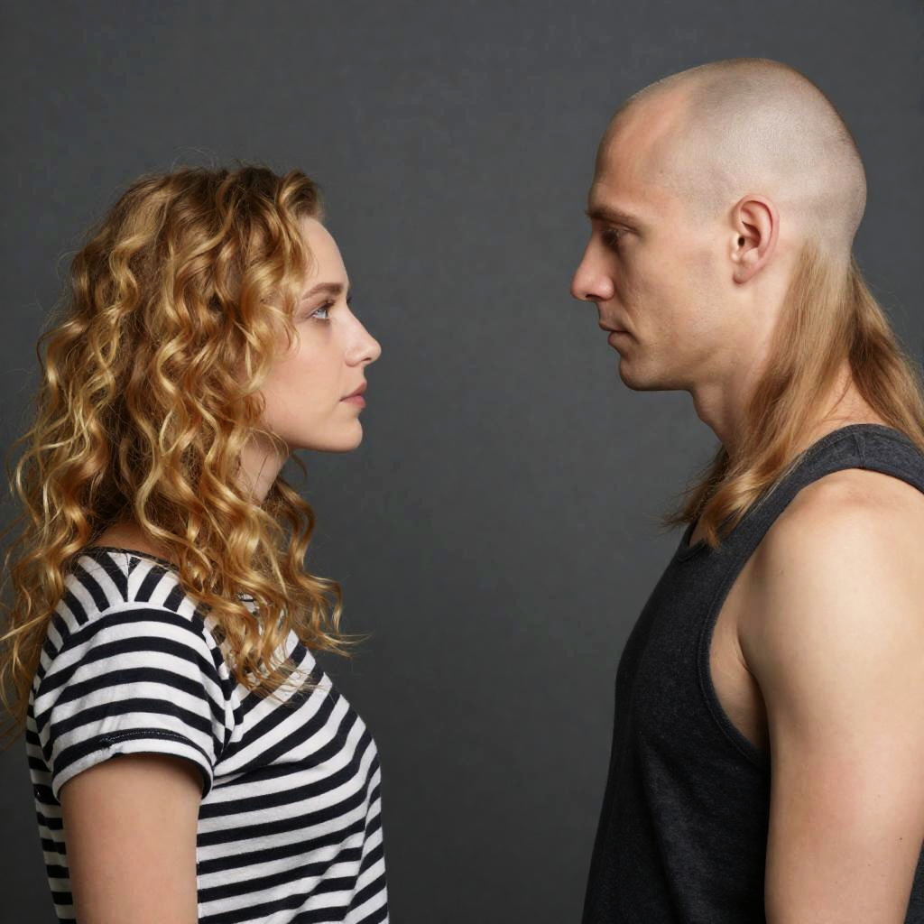Photograph of a blonde woman with curly hair and black-and-white striped shirt facing a bald, blonde-haired man with long hair and a sleeveless shirt. Both are in profile, intensely looking at each other. Grey background. Two people.