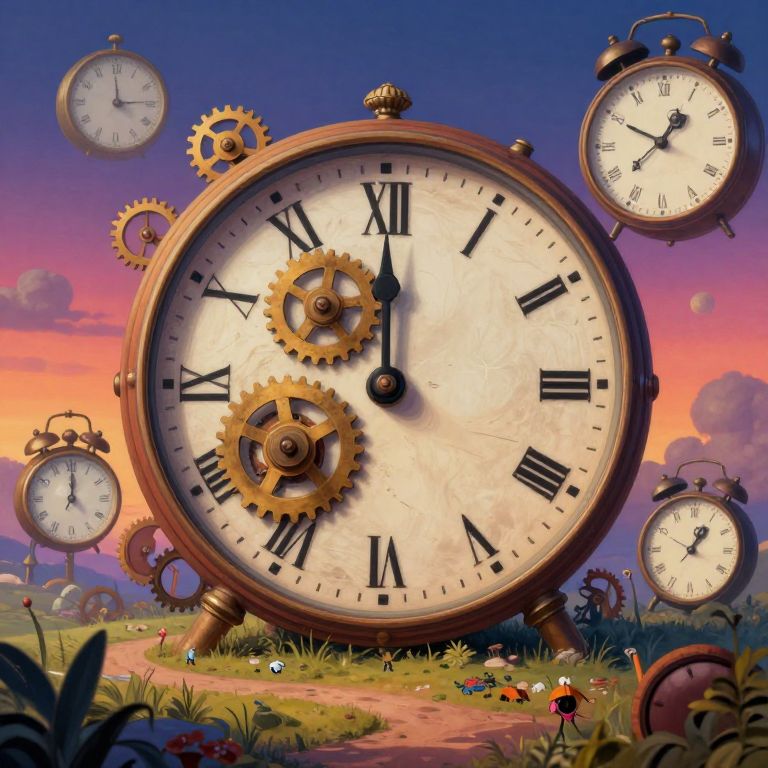 Craft an image in the dreamlike style of surrealist art, depicting a whimsical dreamscape with a colossal clock face adorned with complex gears and cogs, juxtaposed against a backdrop of distorted timepieces. Capture this surreal landscape from a distinctive viewpoint akin to that of a tiny insect, as if seen through its curious eyes, where time appears malleable and intertwined. Employ vibrant color gradients that dynamically shift across the scene, creating an emotional spectrum teetering between whimsy and wonder, enticing viewers into a realm that is both strangely familiar and utterly fantastical.