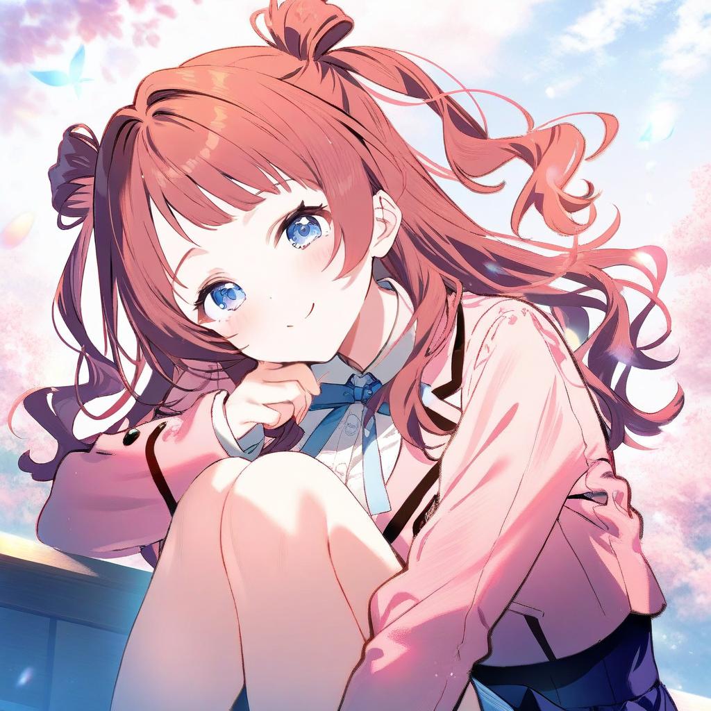 Anime-style illustration of a young girl with long red-brown hair styled in two side buns and curly strands. She has bright blue eyes and soft blush on her cheeks, wearing a pink jacket over a white shirt with a blue ribbon tie. The background features a clear sky with cherry blossom petals, evoking a hanami (cherry blossom viewing) atmosphere.
