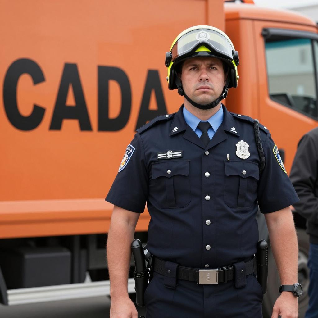 A photograph of a male police officer standing in front of an orange truck with graffiti. He wears a black uniform with silver buttons, a light blue shirt, a black tie, and a black and yellow helmet. His expression is serious. The truck's graffiti spells "CADA" in bold letters. Another partially visible figure in dark clothing is on the right. The officer has a medium build and light skin. The truck's orange color contrasts with the officer's dark uniform.