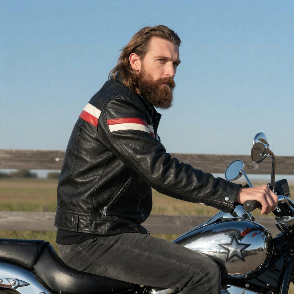 Photograph of a bearded man with long brown hair, wearing a black leather jacket with white and red stripes, sitting on a chrome motorcycle with star decals. He is outdoors, in front of a wooden fence, with a clear blue sky and grassy field in the background. He looks slightly to the side, with his right hand on the motorcycle's handlebar.