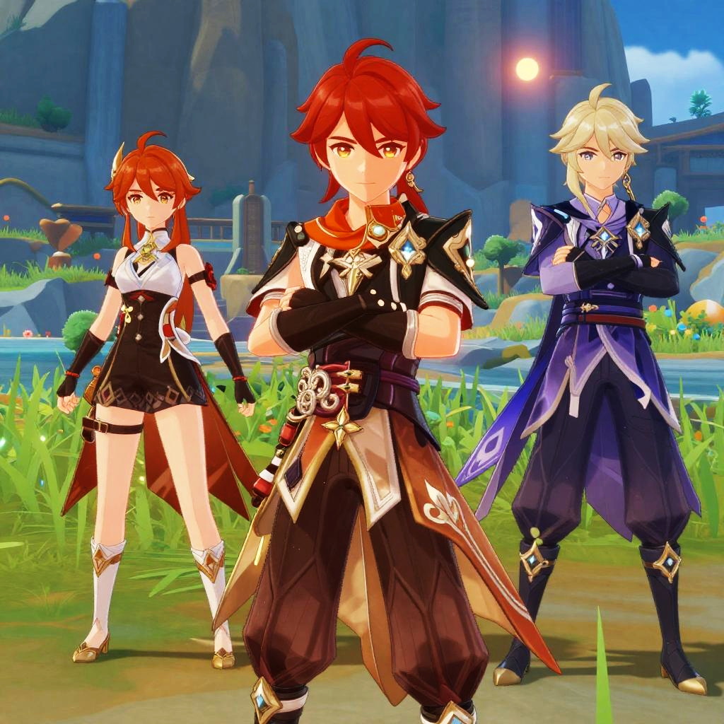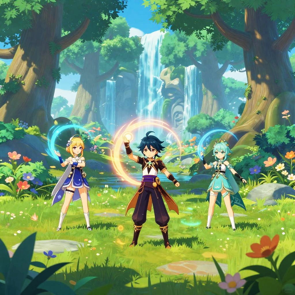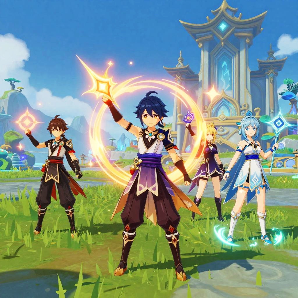 Genshin AI art generator showcasing a vibrant fantasy landscape with elemental magic effects, detailed anime-style characters wielding unique weapons, intricate architecture in the background, and dynamic lighting highlighting the mystical atmosphere.