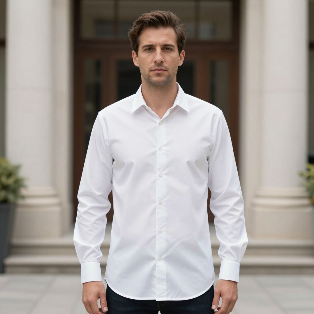 "White Button Shirt Costume, man in white shirt standing in front of a building"