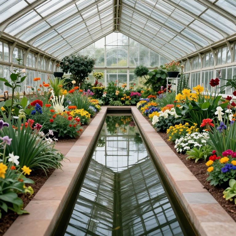 Lush rows of vibrant flowers and greenery thrive along mirrored stone pathways in a serene, arched greenhouse, their reflections shimmering in the tranquil water canal that runs centrally beneath a translucent glass ceiling.