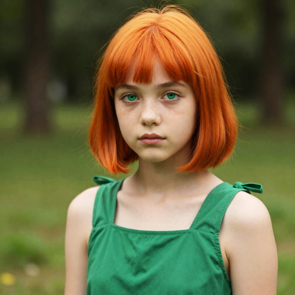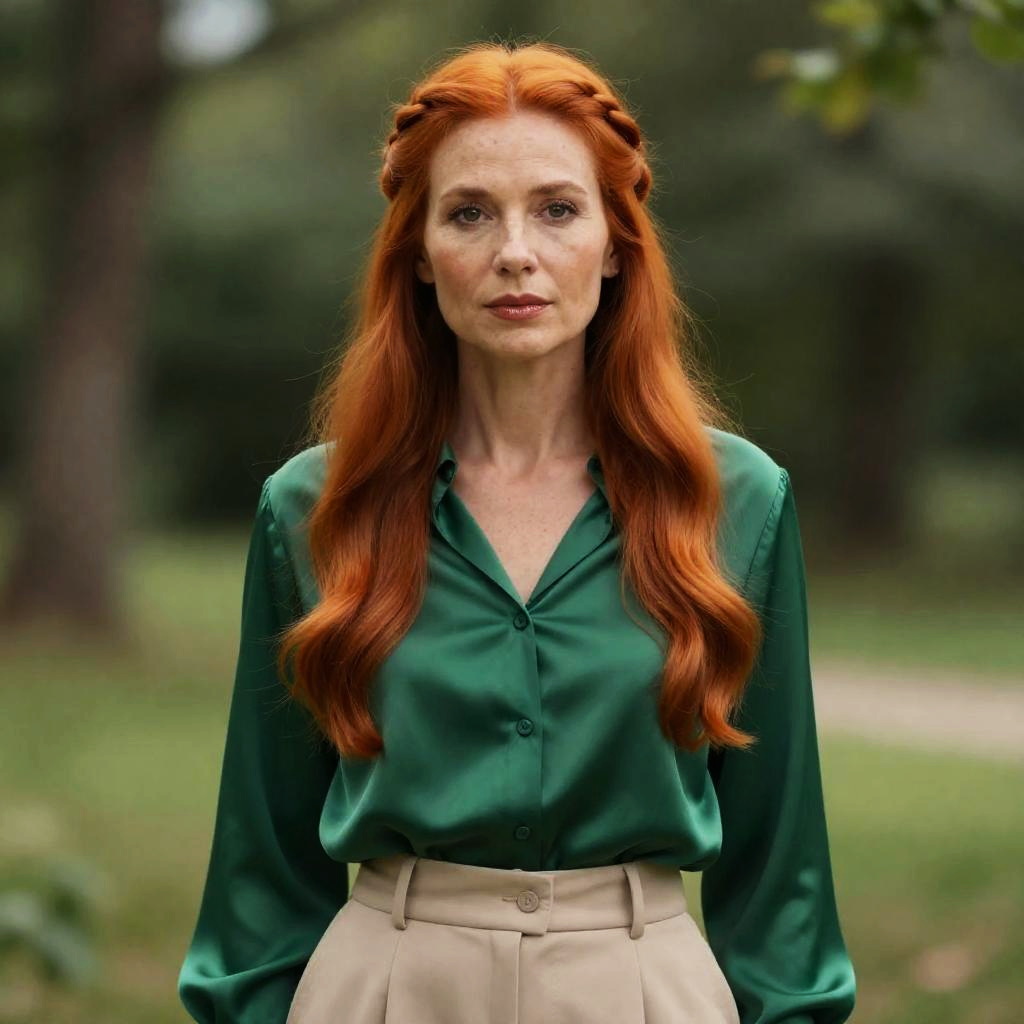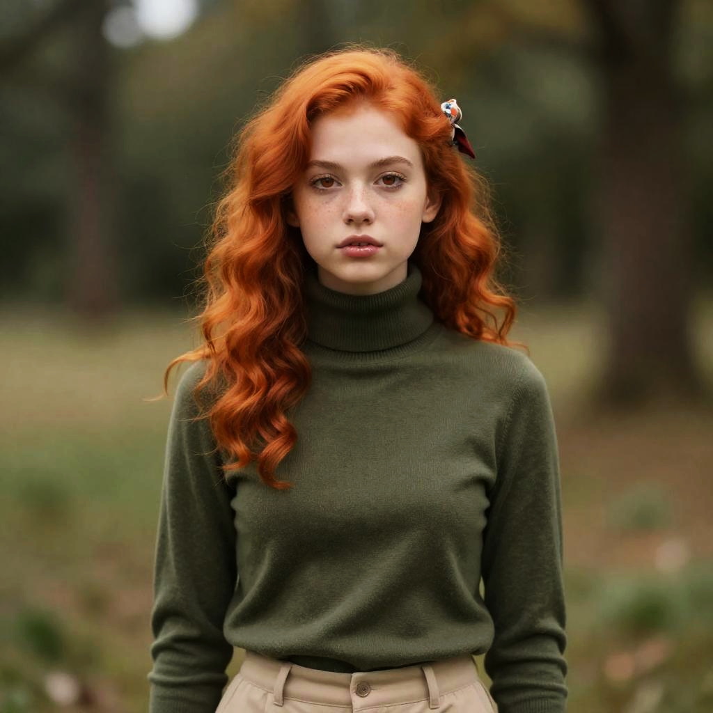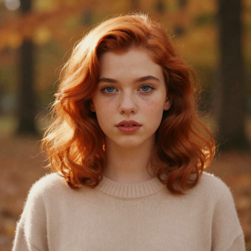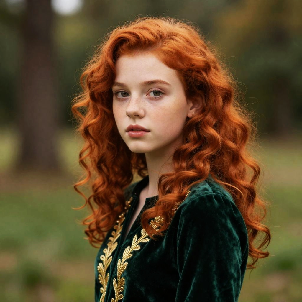 A photorealistic portrait of a young woman with vibrant orange hair styled in short curled hairstyle, soft freckles, emerald green eyes, and glossy lips, wearing an elegant burgundy dress, set against a softly blurred forest glade, gentle natural lighting, shallow depth of field, ultra-detailed realistic rendering.