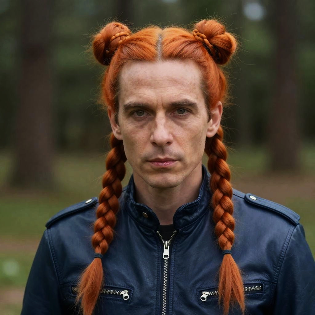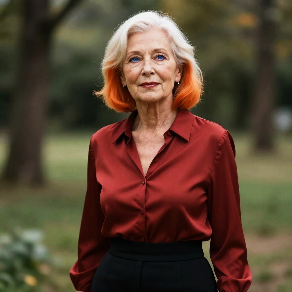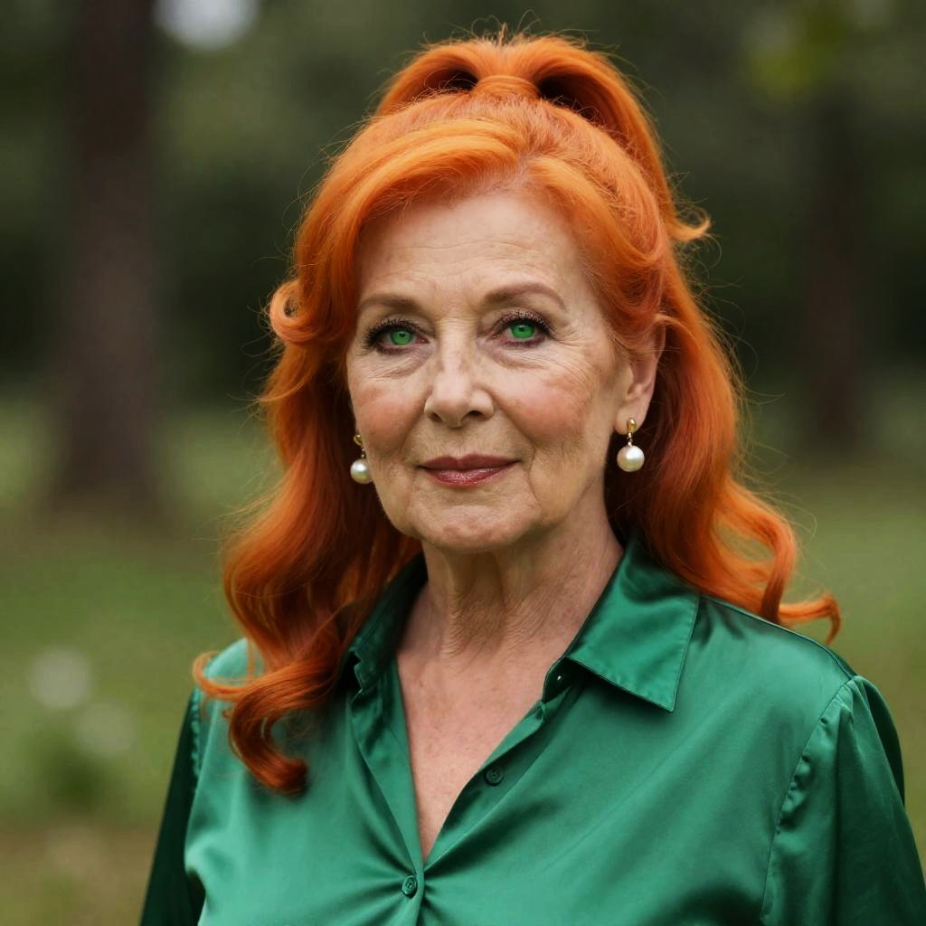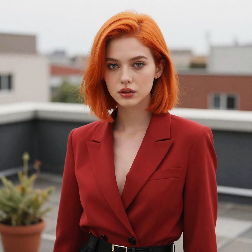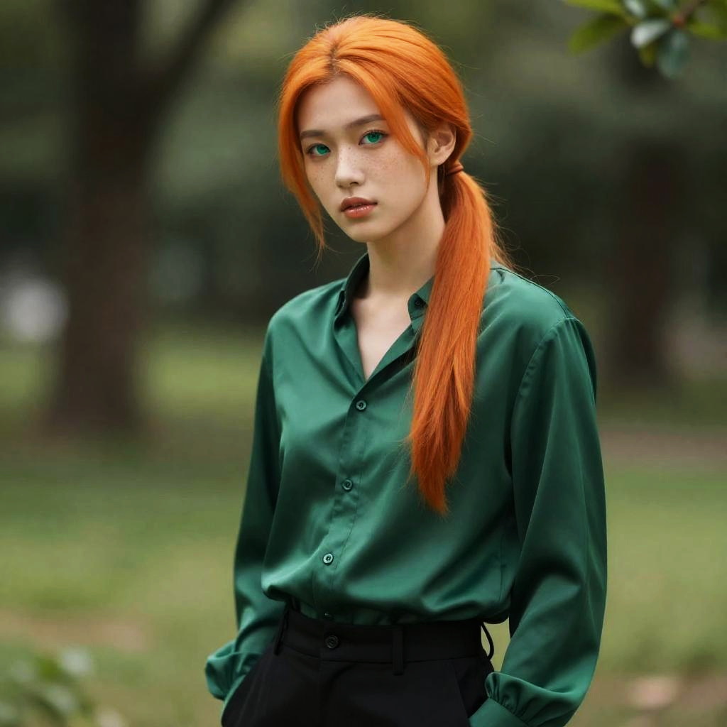 A photorealistic portrait of a young woman with vibrant orange hair styled in short curled hairstyle, soft freckles, emerald green eyes, and glossy lips, wearing an elegant burgundy dress, set against a softly blurred forest glade, gentle natural lighting, shallow depth of field, ultra-detailed realistic rendering.