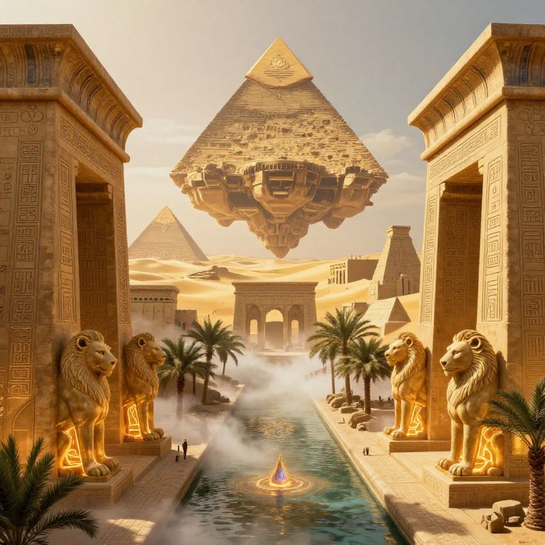 Digital artwork of a golden ancient Egyptian city with floating pyramid, lion statues, palm trees, and misty central fountain.