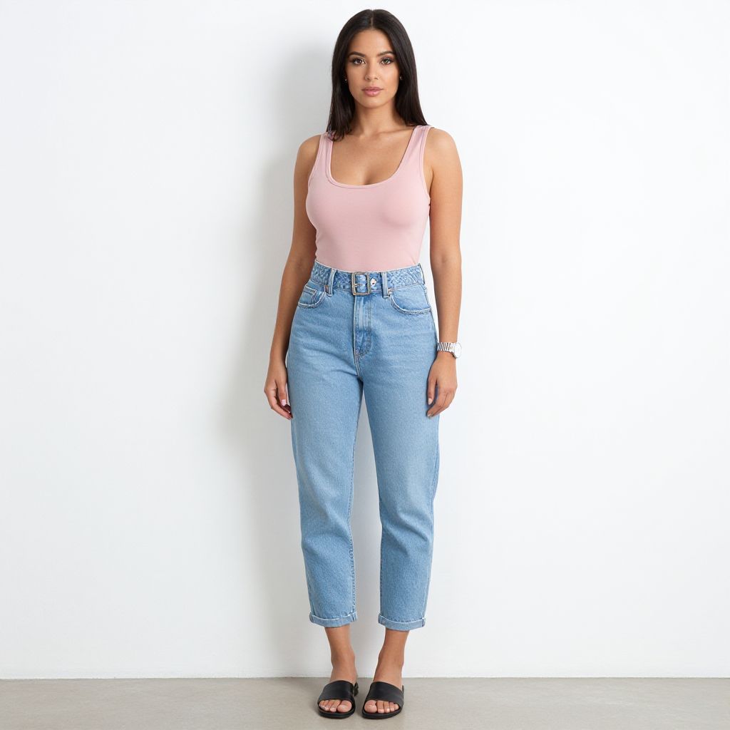 Photograph of a young woman with long black hair standing against a plain white background. She has a medium build, light brown skin, and is wearing a light pink, sleeveless, fitted tank top that reveals a modest bust. She pairs it with high-waisted, light blue, slightly loose, cuffed jeans that end just above her ankles. She completes her outfit with black, open-toed, flat sandals. She stands with her arms relaxed by her sides and a neutral expression on her face. She wears a simple bracelet on her right wrist. The lighting is bright and even, highlighting the clean, minimalist style of the image.