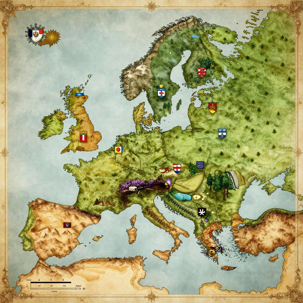 Kingdom map generator producing a beautifully illustrated map of a mythical land, colorful kingdoms distinguished by unique flags and coat of arms, elaborate cartographic details like scale bars, mountains, forests, lakes in old world map aesthetics