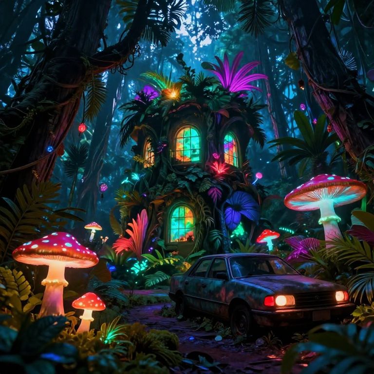A surreal jungle forest scene with glowing mushrooms, an abandoned car, a mysterious building with glowing windows, and an overall neon color palette.