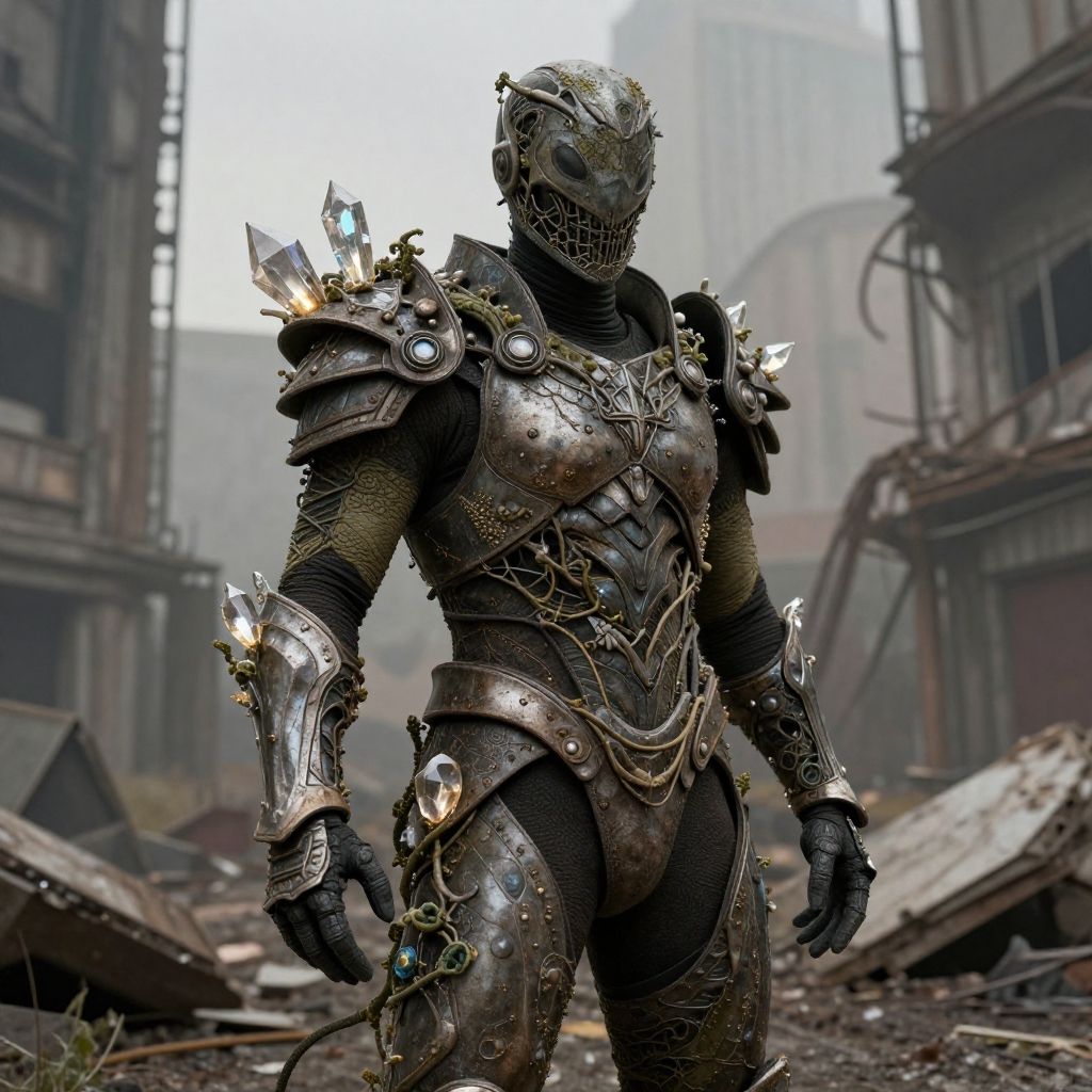 Vidia costume for adults, combining armor and organic elements like vines and glowing crystals, set in a post-apocalyptic ruined city, gritty and detailed, emphasizing texture contrasts and mood lighting
