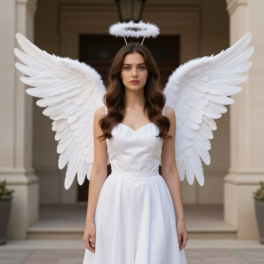 Photograph of a young woman standing in front of a stone building. She has long, wavy brown hair and wears a white, sleeveless, satin dress that reaches her ankles. She has large, white, feathered angel wings and a white halo above her head. Her expression is neutral, and she has light makeup with red lipstick. The background features a beige, arched doorway with potted plants on either side. The image has a soft, ethereal quality, enhanced by the bright white angelic accessories and dress.