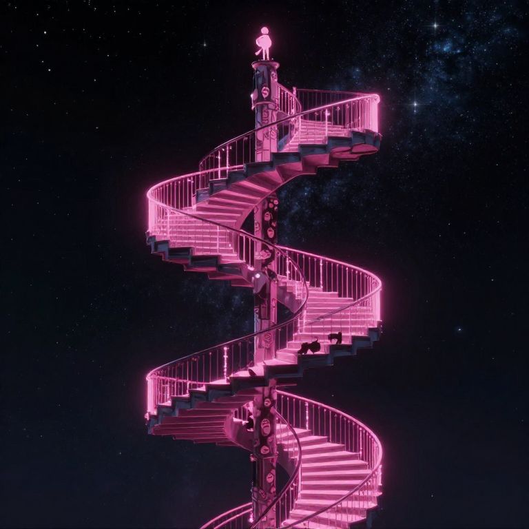 In the void between stars, a staircase spirals endlessly upward, built from the forgotten footsteps of cosmic travelers and pink neon echoes.