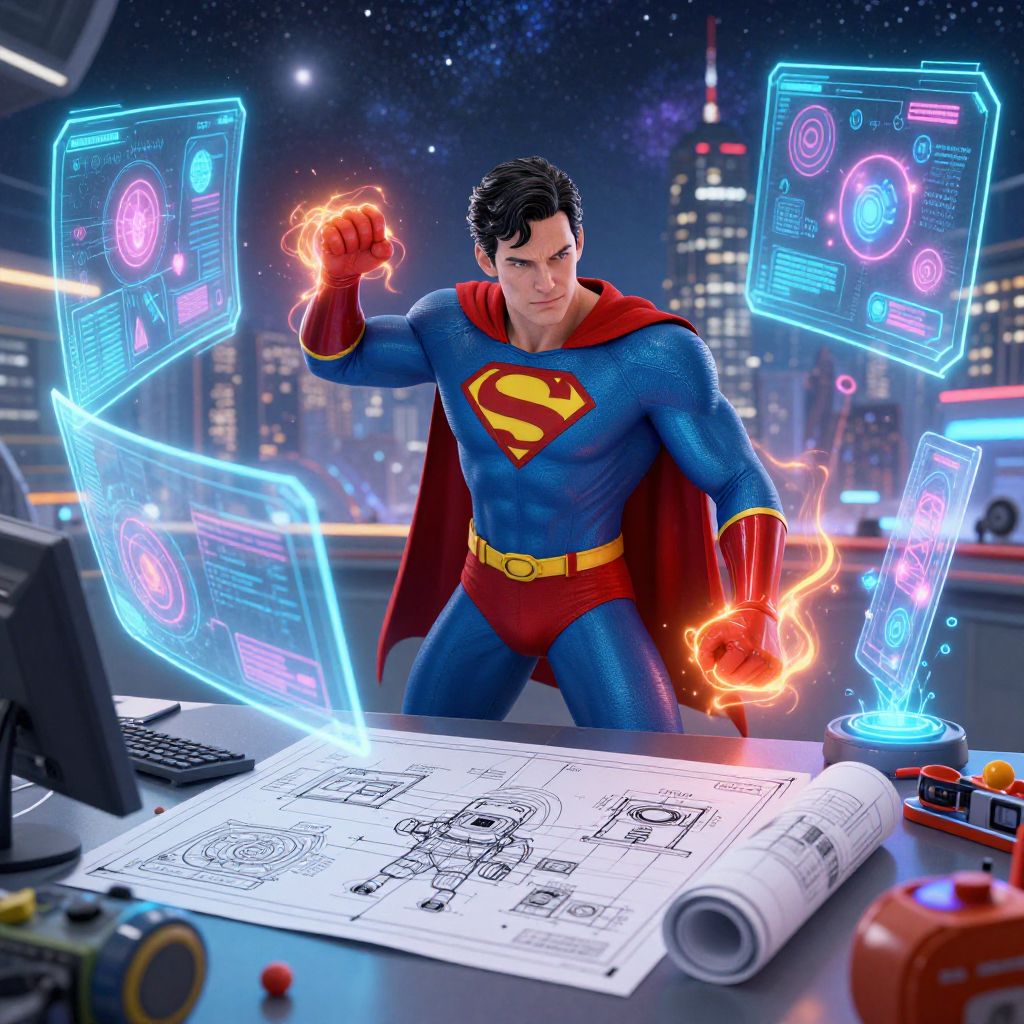 Photograph-style digital illustration of Superman standing in a high-tech office at night, with a city skyline in the background. Superman, a muscular man with short black hair, wears his iconic blue suit with a red cape and "S" emblem, red trunks, and yellow belt. He has glowing, fiery hands and is surrounded by floating holographic screens displaying colorful, neon-blue tech interfaces. In front of him, a large blueprint of a robotic figure is spread on a desk, accompanied by a laptop, a red toy car, and various tech gadgets. The scene combines superhero elements with modern technology.