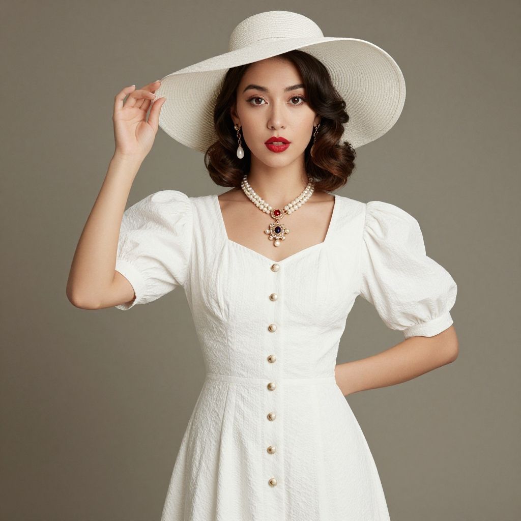 A woman dressed in a vintage-inspired white dress with puff sleeves and button details poses against a neutral background. She accessorizes with elegant jewelry and a wide-brimmed hat, showcasing a classic and sophisticated style with soft curls and bold red lips.